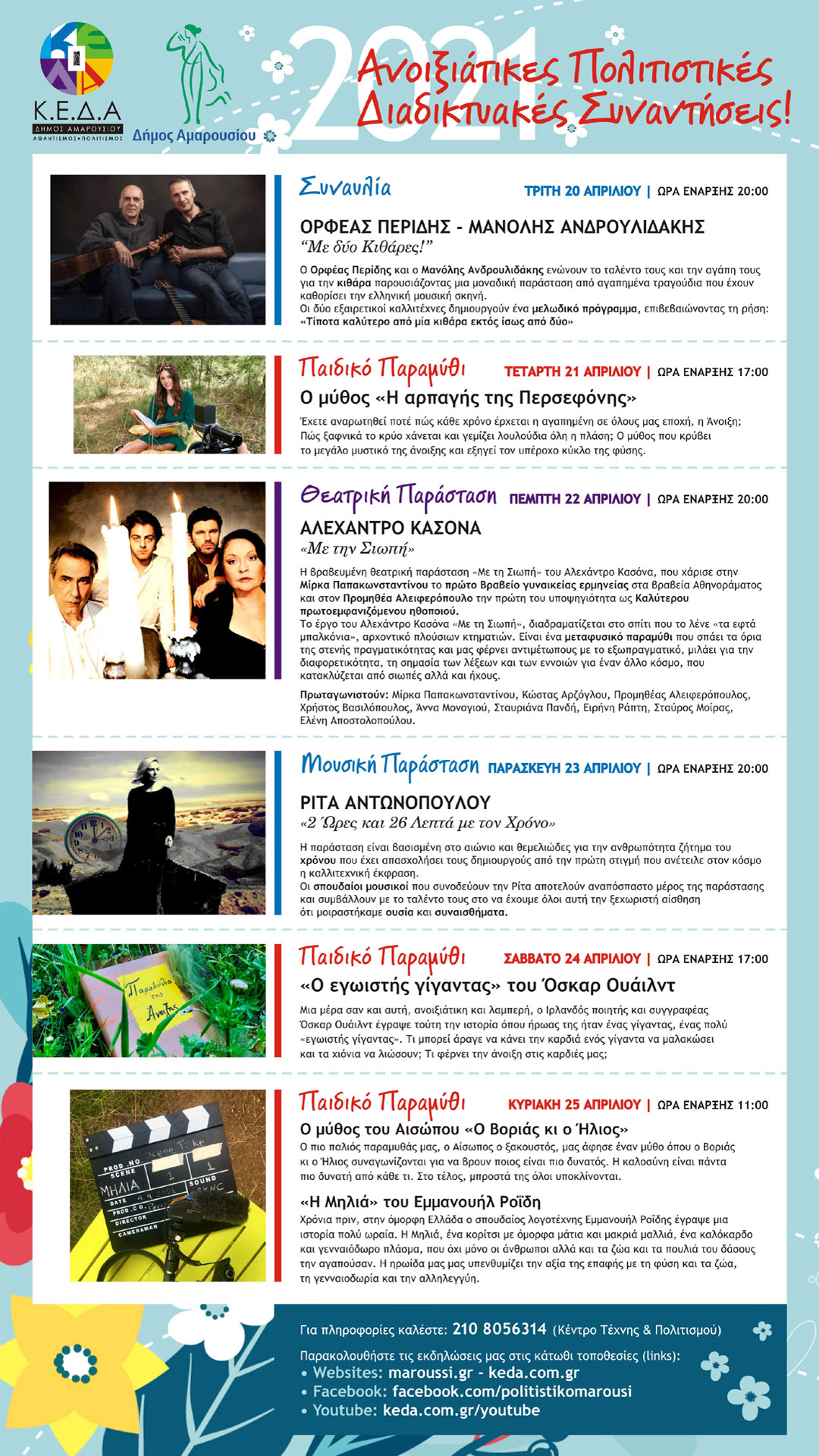 Με τις οδηγίες του Δημάρχου Αμαρουσίου Θεόδωρου Αμπατζόγλου, και στο πλαίσιο διαδικτυακών δράσεων με ευθύνη της ΚΕΔΑ και του Προέδρου της Νίκου Πέππα, που στοχεύουν στην ψυχαγωγία των Μαρουσιωτών, διοργανώνεται μία εβδομάδα γεμάτη μουσική, παραμύθια και θέατρο, για μικρούς και μεγάλους από την Τρίτη 20 Απριλίου μέχρι και την Κυριακή 25 Απριλίου 2021.