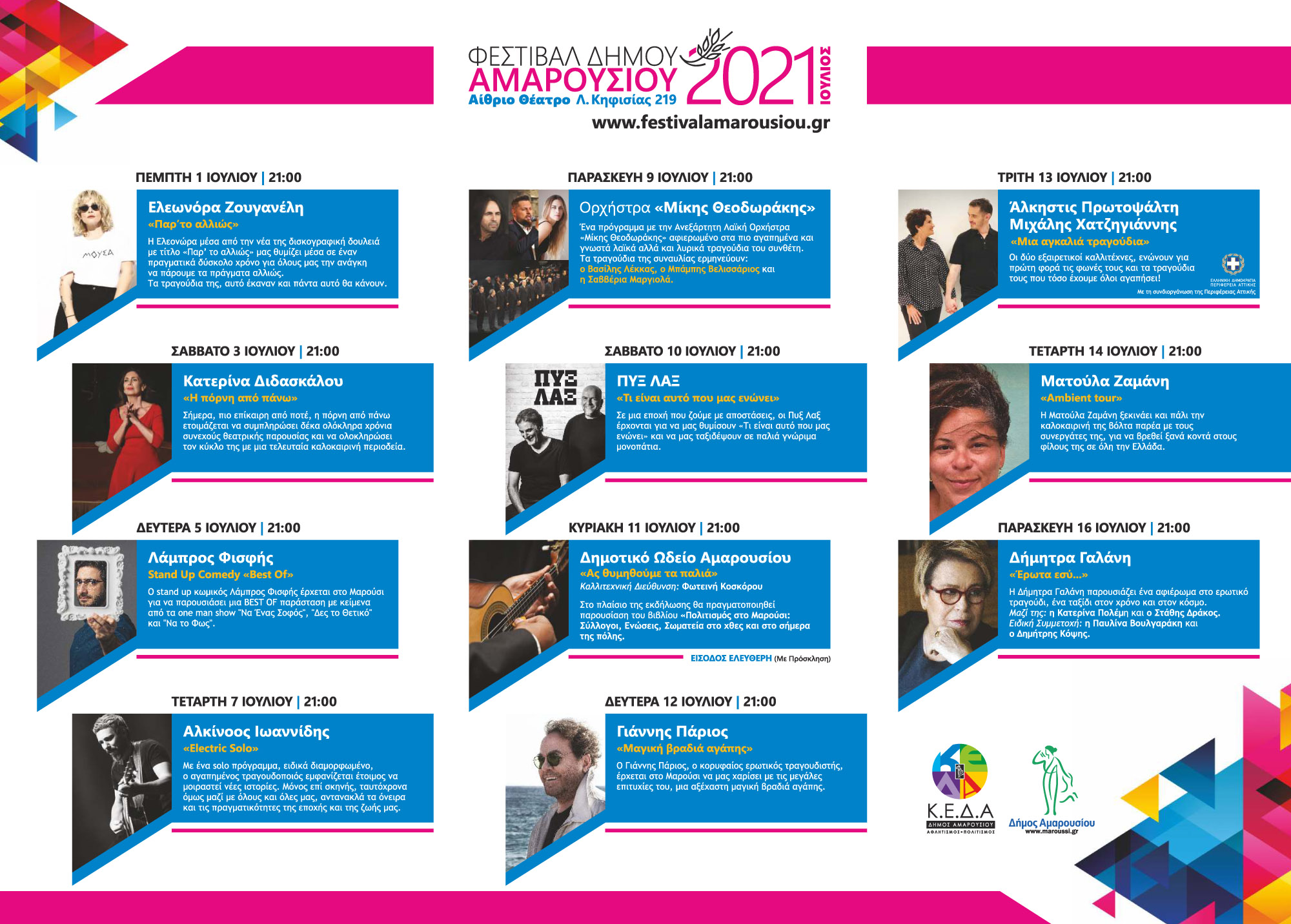 Την αυλαία του προγράμματος ανοίγει η πολυαγαπημένη στο κοινό Ελεωνόρα Ζουγανέλλη και ακολούθως τη σκυτάλη παίρνουν η θεατρική παράσταση με την Κατερίνα Διδασκάλου «Η πόρνη από πάνω», ο stand up κωμικός Λάμπρος Φισφής, ο αγαπημένος τραγουδοποιός Αλκίνοος Ιωαννίδης, η Ορχήστρα «Μίκης Θεοδωράκης» με τραγούδια αφιερωμένα στα πιο αγαπημένα και γνωστά λαϊκά, αλλά και λυρικά τραγούδια του συνθέτη, οι καταξιωμένοι ΠΥΞ ΛΑΞ, το Δημοτικό Ωδείο Αμαρουσίου, ο κορυφαίος ερωτικός τραγουδιστής Γιάννης Πάριος, οι δύο εξαιρετικοί καλλιτέχνες Άλκηστης Πρωτοψάλτη και Μιχάλης Χατζηγιάννης, η αγαπημένη Ματούλα Ζαμάνη και η μοναδική Δήμητρα Γαλάνη.