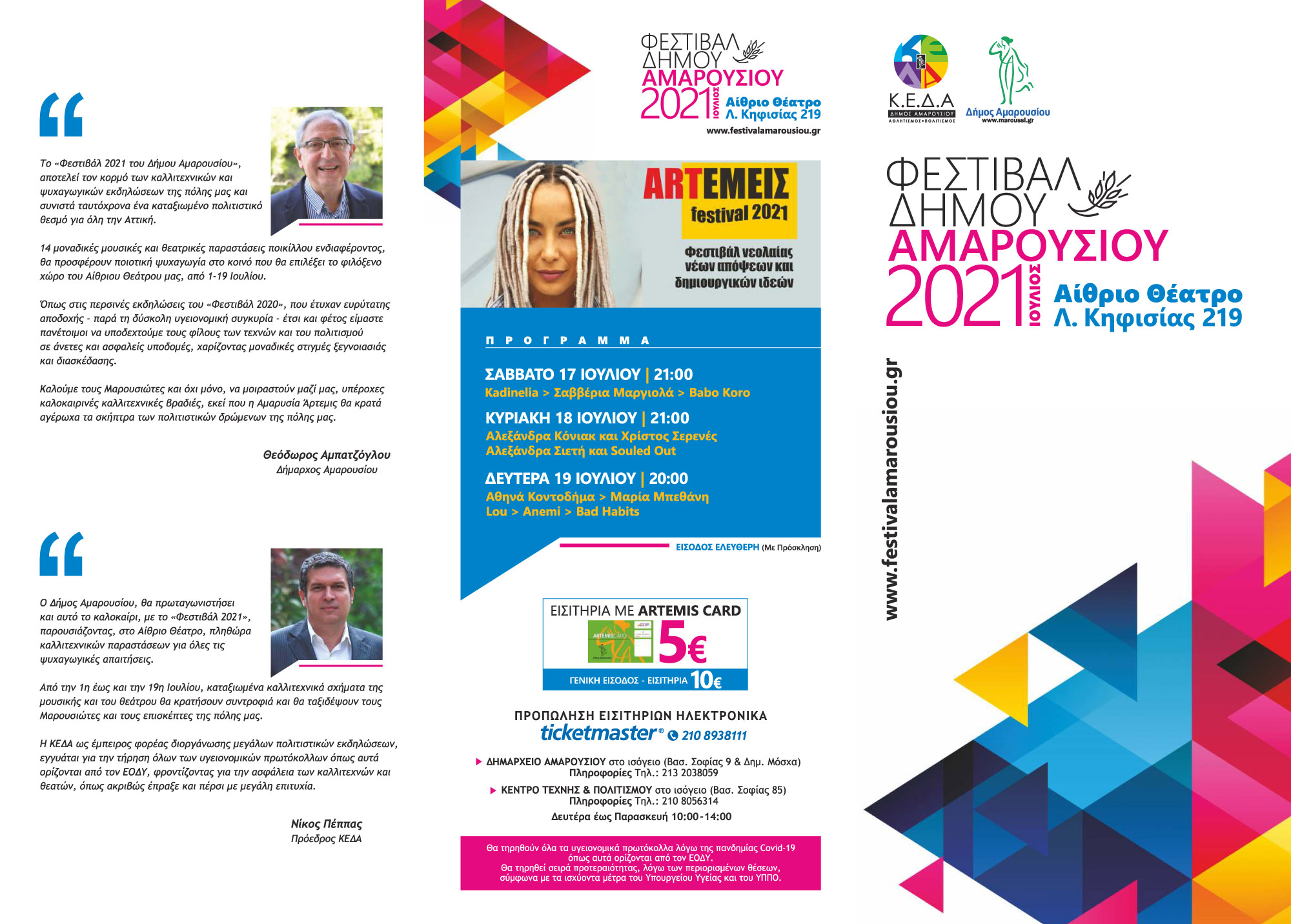 Ο Πρόεδρος της ΚΕΔΑ κ. Νίκος Πέππας σημείωσε από την πλευρά του ότι μετά την επιτυχή διοργάνωση του περσινού Φεστιβάλ κάτω από πολύ ιδιαίτερες συνθήκες, φέτος τολμάμε ξανά με μεγαλύτερη αισιοδοξία και διοργανώνουμε το Φεστιβάλ του Δήμου μας, λαμβάνοντας όλα τα μέτρα πρόληψης και προστασίας όπως ορίζονται από τον ΕΟΔΥ για την ασφάλεια των καλλιτεχνών και του κοινού. Σημαντικά ονόματα του θεάτρου και του ελληνικού πενταγράμμου θα μας κρατήσουν συντροφιά και θα ταξιδέψουν τους Μαρουσιώτες και τους επισκέπτες της πόλης.