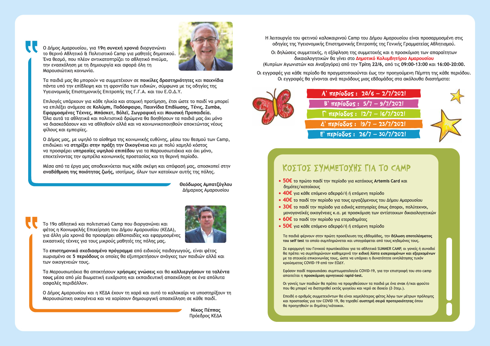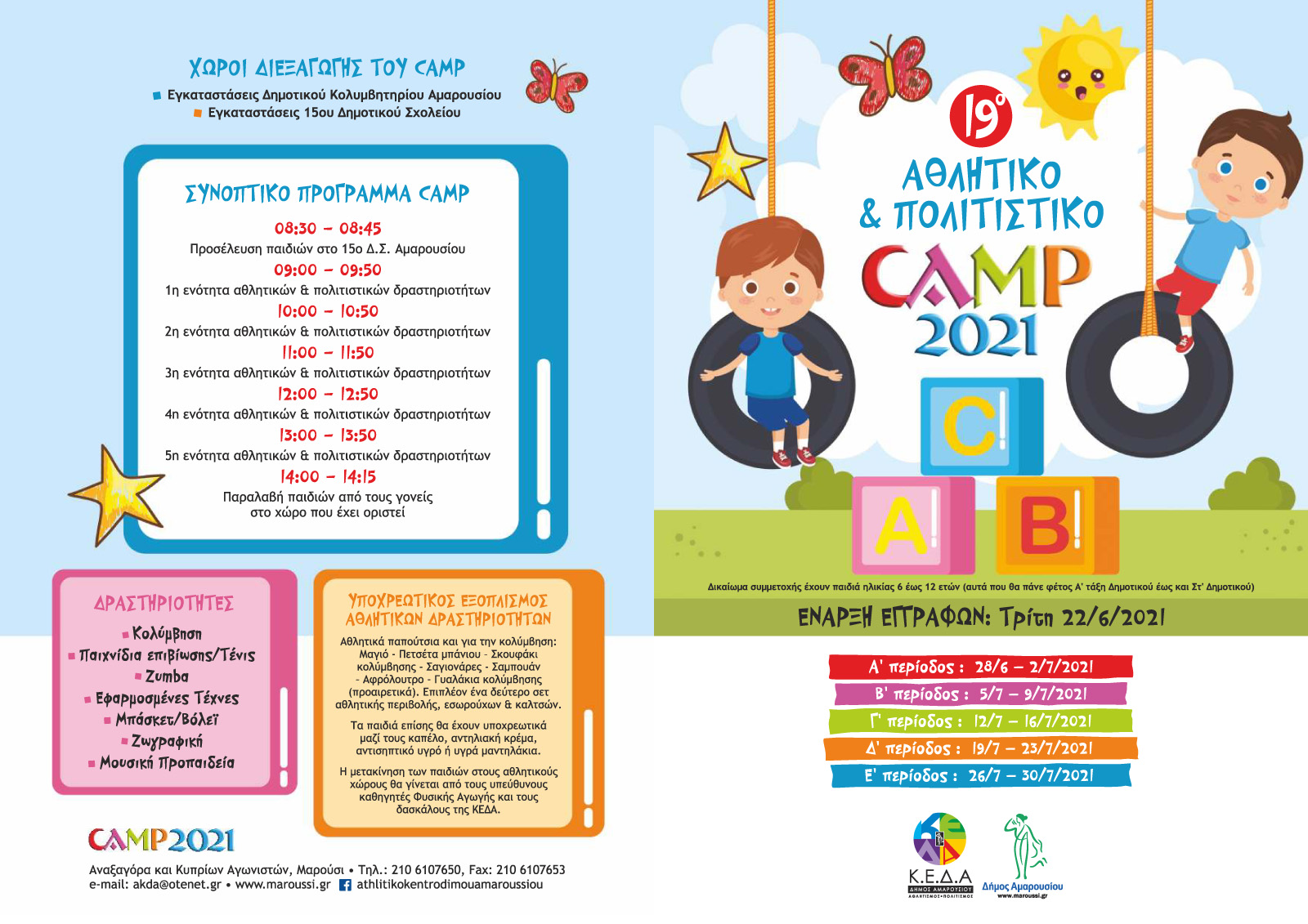 Ο Δήμος Αμαρουσίου μέσω της ΚΕΔΑ, διοργανώνει για 19η συνεχή χρονιά τον θεσμό πλέον του «Αθλητικού & Πολιτιστικού Camp» που σκοπό έχει να προάγει το αθλητικό πνεύμα, τη βιωματική δραστηριότητα, τη βοήθεια στη Μαρουσιώτικη οικογένεια.