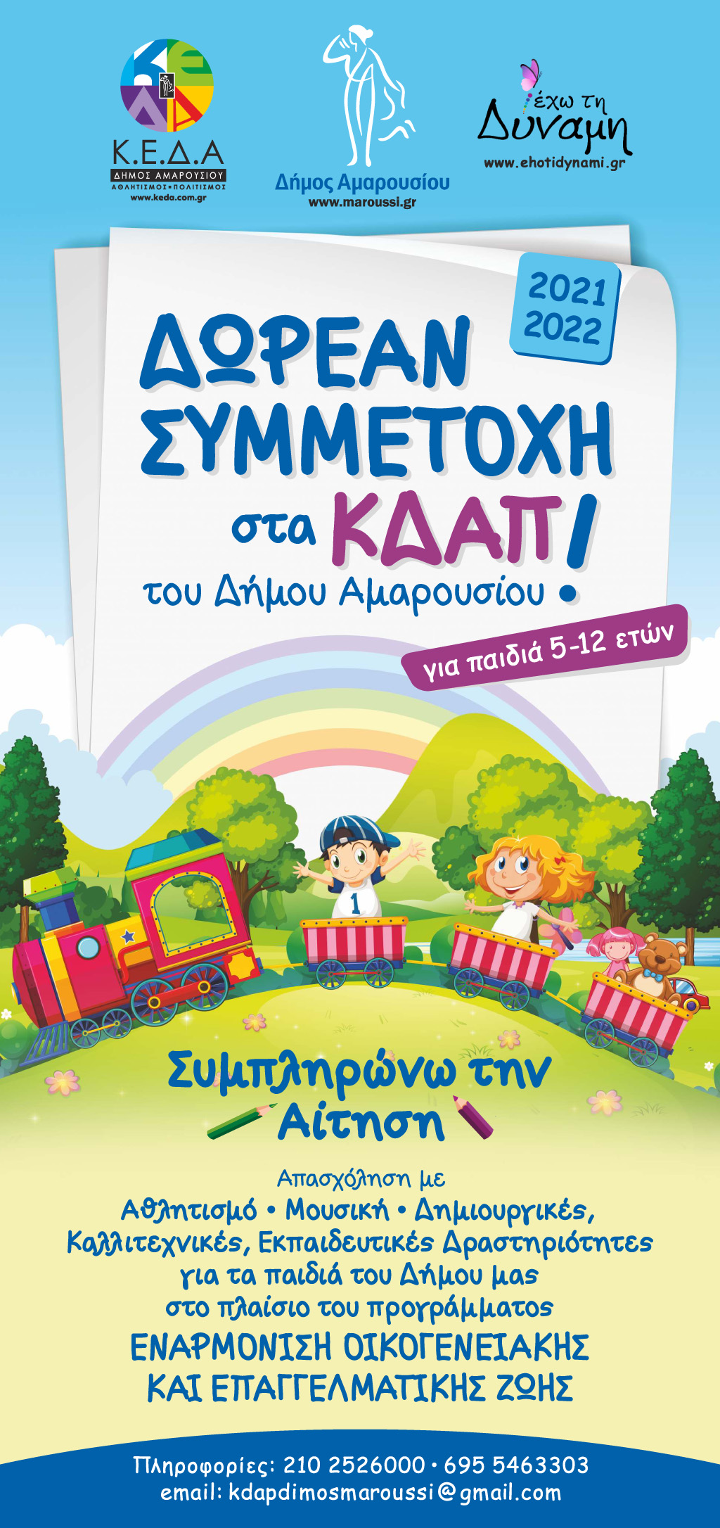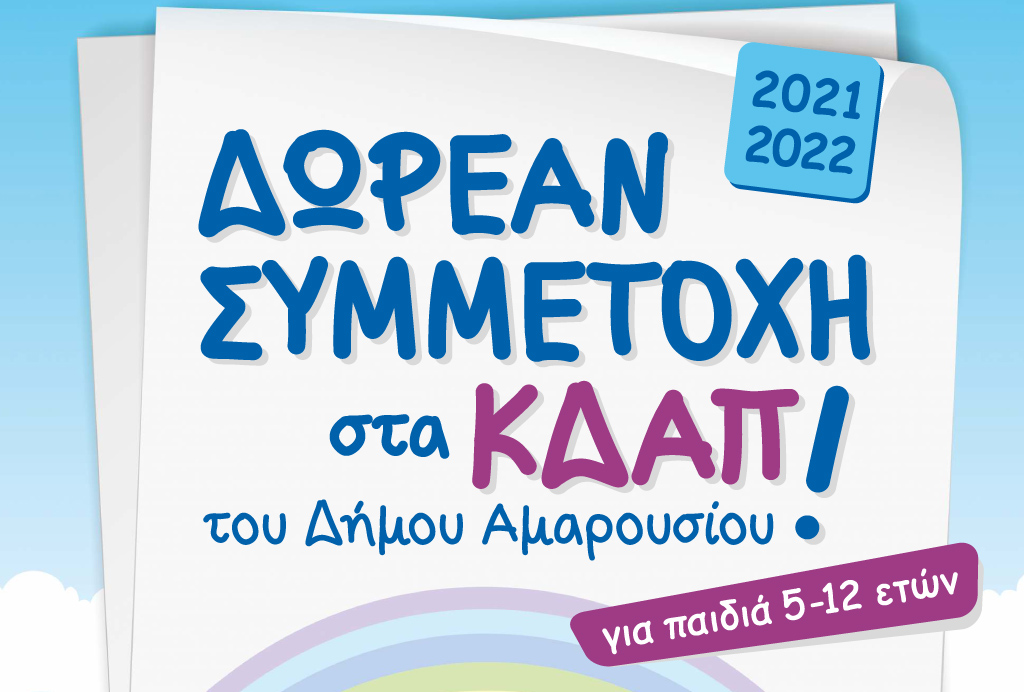 O Δήμος Αμαρουσίου και η Κοινωφελής Επιχείρηση του Δήμου (Κ.Ε.Δ.Α.) σε συνεργασία με το Ανθρωπιστικό μη Κερδοσκοπικό Σωματείο «ΕΧΩ ΤΗ ΔΥΝΑΜΗ» θα λειτουργήσουν ΔΩΡΕΑΝ δύο (2) Κέντρα Δημιουργικής Απασχόλησης (ΚΔΑΠ) για παιδιά ηλικίας 5-12 ετών .