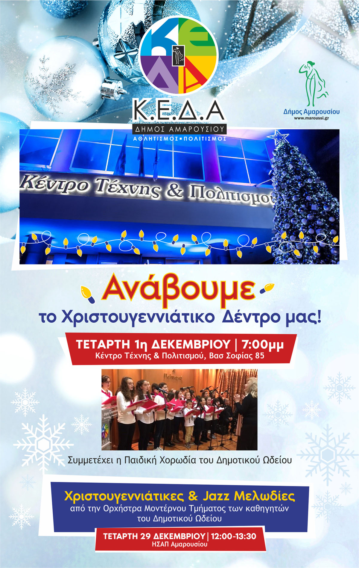 Η τελετή αφής του Χριστουγεννιάτικού Δέντρου, παρουσία του Δημάρχου Αμαρουσίου Θεόδωρου Αμπατζόγλου και του Προέδρου της ΚΕΔΑ Νικόλαου Πέππα, θα πραγματοποιηθεί την Τετάρτη 1η Δεκεμβρίου 2021 και ώρα 7:00 μ.μ., στον προαύλιο χώρο του Κέντρου Τέχνης και Πολιτισμού (Βασ. Σοφίας 85), τηρουμένων των υγειονομικών πρωτοκόλλων που επιβάλλει η λοίμωξη Covid-19.