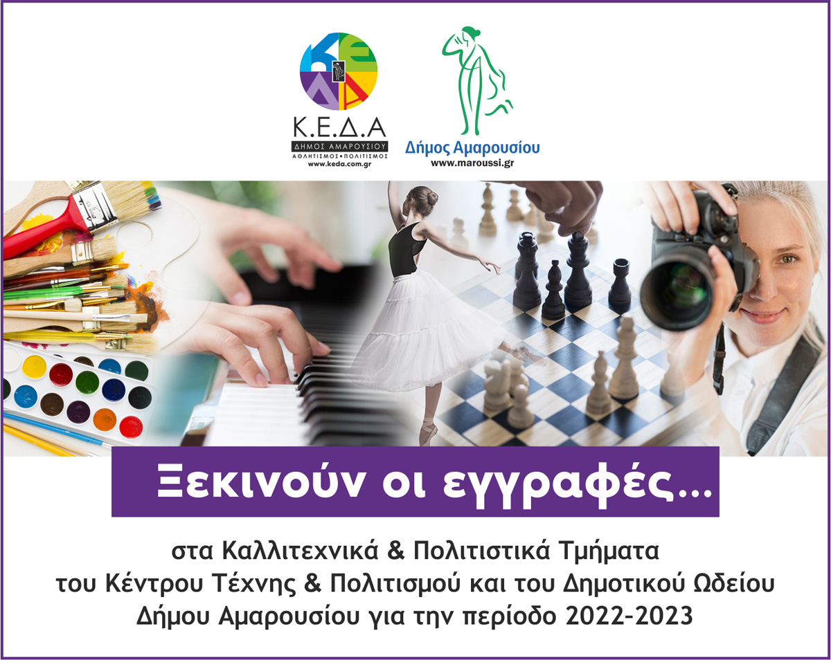 Ο Δήμαρχος Αμαρουσίου Θεόδωρος Αμπατζόγλου και ο Πρόεδρος της Κοινωφελούς Επιχείρησης του Δήμου (ΚΕΔΑ) Νίκος Πέππας προσκαλούν τις Μαρουσιώτισσες και τους Μαρουσιώτες να συμμετέχουν σε μία νέα εκπαιδευτική και ψυχαγωγική χρονιά μέσα από πληθώρα προγραμμάτων και επιλογών τόσο του Κέντρου Τέχνης και Πολιτισμού όσο και του Δημοτικού Ωδείου «Μίκης Θεοδωράκης». Όπως επισημαίνουν στις δηλώσεις τους η μεγάλη επιτυχία συμμετοχών και εκδηλώσεων της προηγούμενης χρονιάς αποτελεί την εγγύηση πως και φέτος οι μαθητές και μέλη θα έχουν τη χαρά της ανάπτυξης δεξιοτήτων τους και της δημιουργικής απασχόλησης υψηλού επιπέδου.