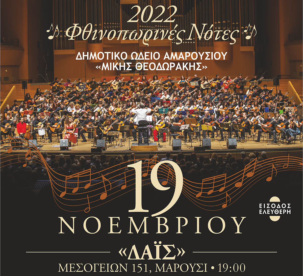 Εμβληματικά έργα των δύο σημαντικότερων Ελλήνων μουσικοσυνθετών του Μίκη Θεοδωράκη και του Μάνου Χατζιδάκι θα ερμηνεύσει η Κιθαριστική Ορχήστρα του Δημοτικού Ωδείου Αμαρουσίου «Μίκης Θεοδωράκης», με τη συμμετοχή της Παιδικής Χορωδίας του Ωδείου και των String Demons στη συναυλία που διοργανώνει ο Δήμος Αμαρουσίου και η Κοινωφελής Επιχείρηση (ΚΕΔΑ) με τίτλο: «Φθινοπωρινές Νότες».