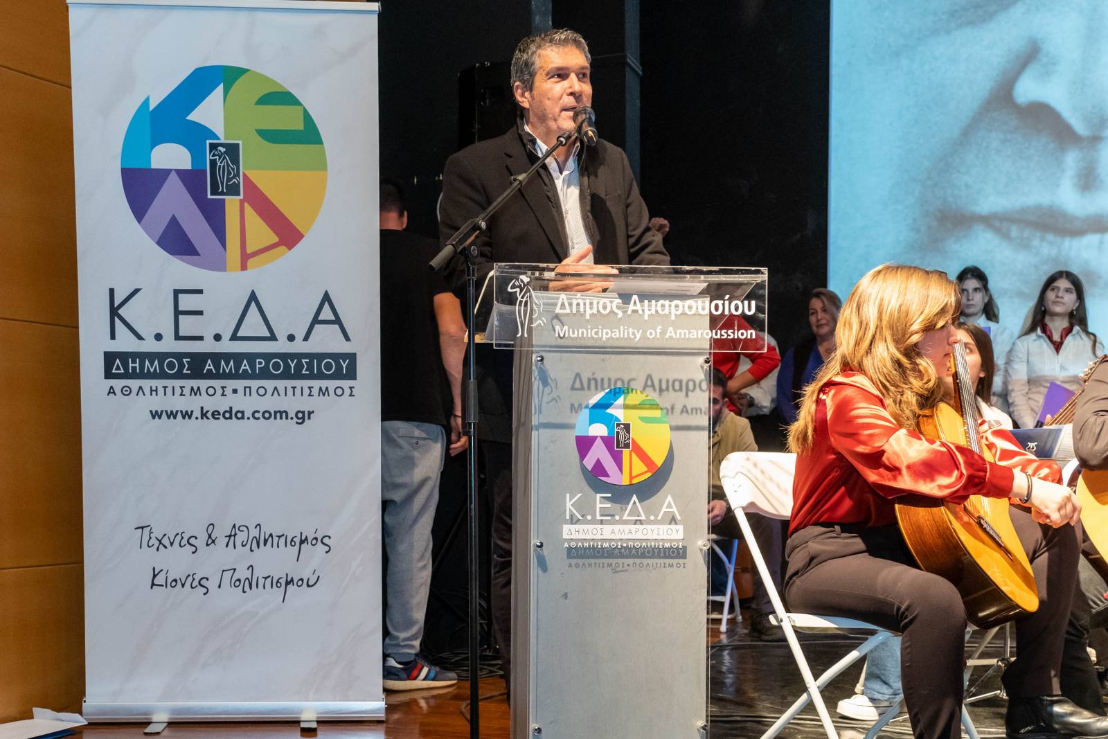 Ο Δήμαρχος Αμαρουσίου Θεόδωρος Αμπατζόγλου στο σύντομο χαιρετισμό του αναφέρθηκε με τα θερμότερα λόγια στη δουλειά που γίνεται στο Δημοτικό Ωδείο «Μίκης Θεοδωράκης» που αποτελεί πρότυπο μουσικής παιδείας, συνεχάρη όλους τους συντελεστές της εξαιρετικής συναυλίας, ενώ δεν παρέλειψε να αναφερθεί και στην ΚΕΔΑ για την άριστη διοργάνωση. Ο Δήμαρχος τέλος προέτρεψε το κοινό να παρακολουθήσει το πρόγραμμα των Χριστουγεννιάτικων εκδηλώσεων που ετοιμάζει ο Δήμος και να συμμετέχει σε αυτό καθώς επιφυλάσσονται πολλές εκπλήξεις για μικρούς και μεγάλους.