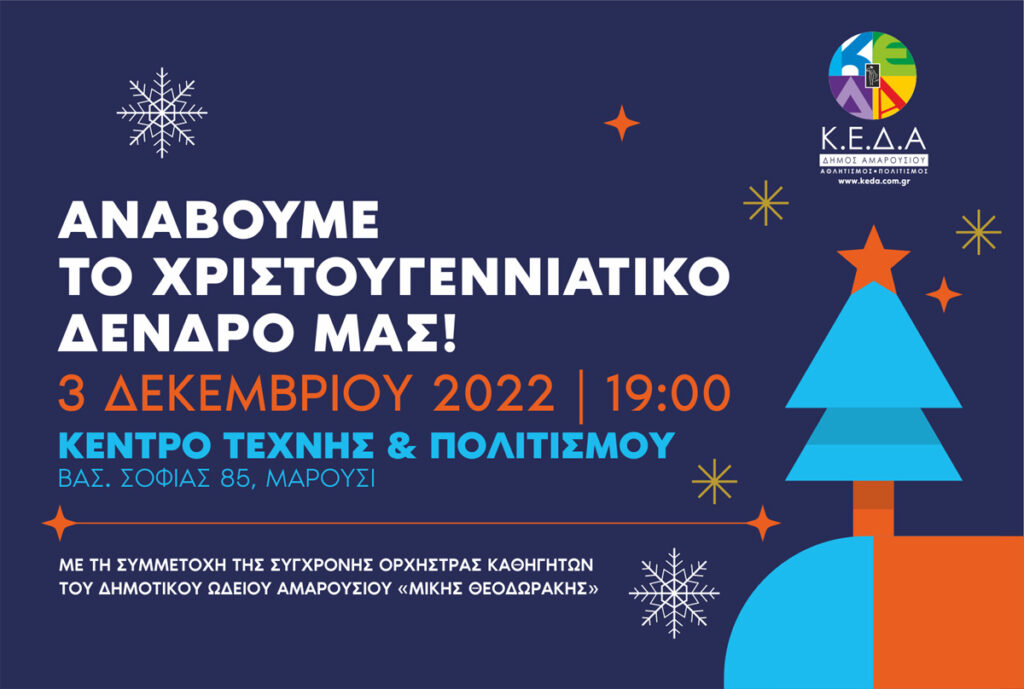 Το Σάββατο 3 Δεκεμβρίου 2022 και ώρα 7.00 μ.μ., παρουσία του Δημάρχου Αμαρουσίου Θεόδωρου Αμπατζόγλου θα πραγματοποιηθεί η τελετή φωταγώγησης του Χριστουγεννιάτικου Δένδρου της Κοινωφελούς Επιχείρησης Δήμου Αμαρουσίου ΚΕΔΑ, στον προαύλιο χώρο του Κέντρου Τέχνης και Πολιτισμού (Βασ. Σοφίας 85, Μαρούσι). Το εορταστικό σκηνικό της φωταγώγησης του Χριστουγεννιάτικου Δένδρου της ΚΕΔΑ, θα πλαισιώσει με τις μελωδίες της, η Σύγχρονη Ορχήστρα Καθηγητών του Δημοτικού Ωδείου Αμαρουσίου «Μίκης Θεοδωράκης», εισάγοντας μουσικά τους παρευρισκόμενους […]