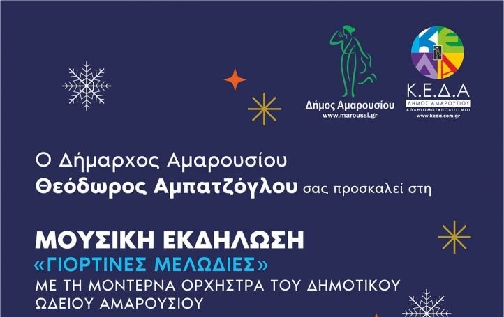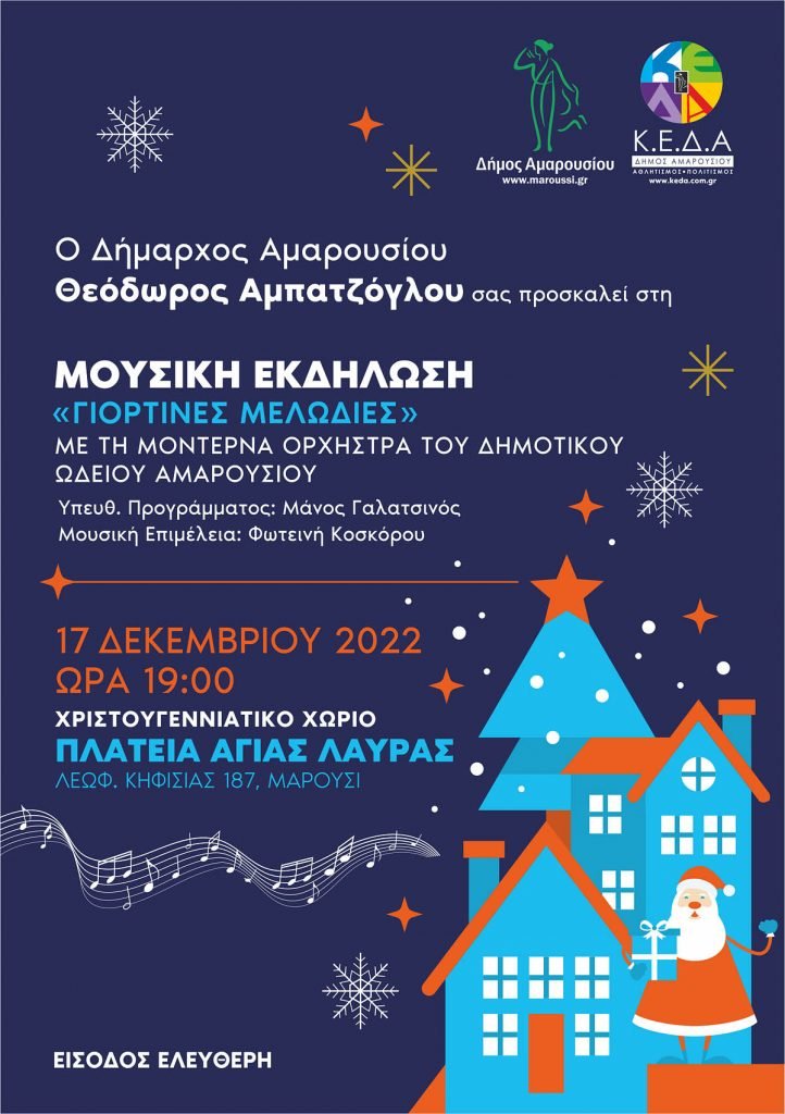 Ο Δήμαρχος Αμαρουσίου Θεόδωρος Αμπατζόγλου προσκαλεί μικρούς και μεγάλους να διασκεδάσουν και να παρακολουθήσουν τη Μουσική Εκδήλωση «Γιορτινές Μελωδίες» στην πλατεία Αγίας Λαύρας (Λεωφ. Κηφισίας 187, Μαρούσι) το Σάββατο, 17 Δεκεμβρίου 2022 στις 19:00.