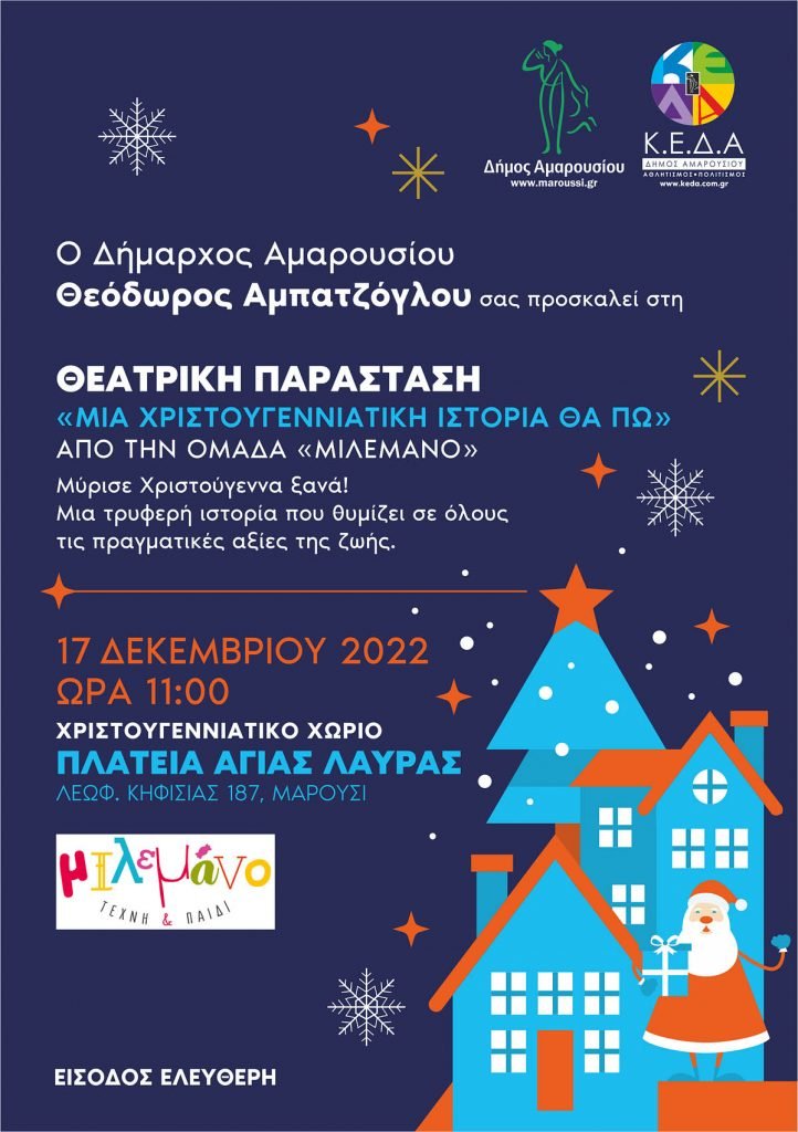 Ο Δήμαρχος Αμαρουσίου Θεόδωρος Αμπατζόγλου προσκαλεί μικρούς και μεγάλους να παρακολουθήσουν τη Θεατρική Παράσταση «Μια Χριστουγεννιάτικη Ιστορία θα πω» στην πλατεία Αγίας Λαύρας (Λεωφ. Κηφισίας 187, Μαρούσι) το Σάββατο, 17 Δεκεμβρίου 2022 στις 11 πμ.