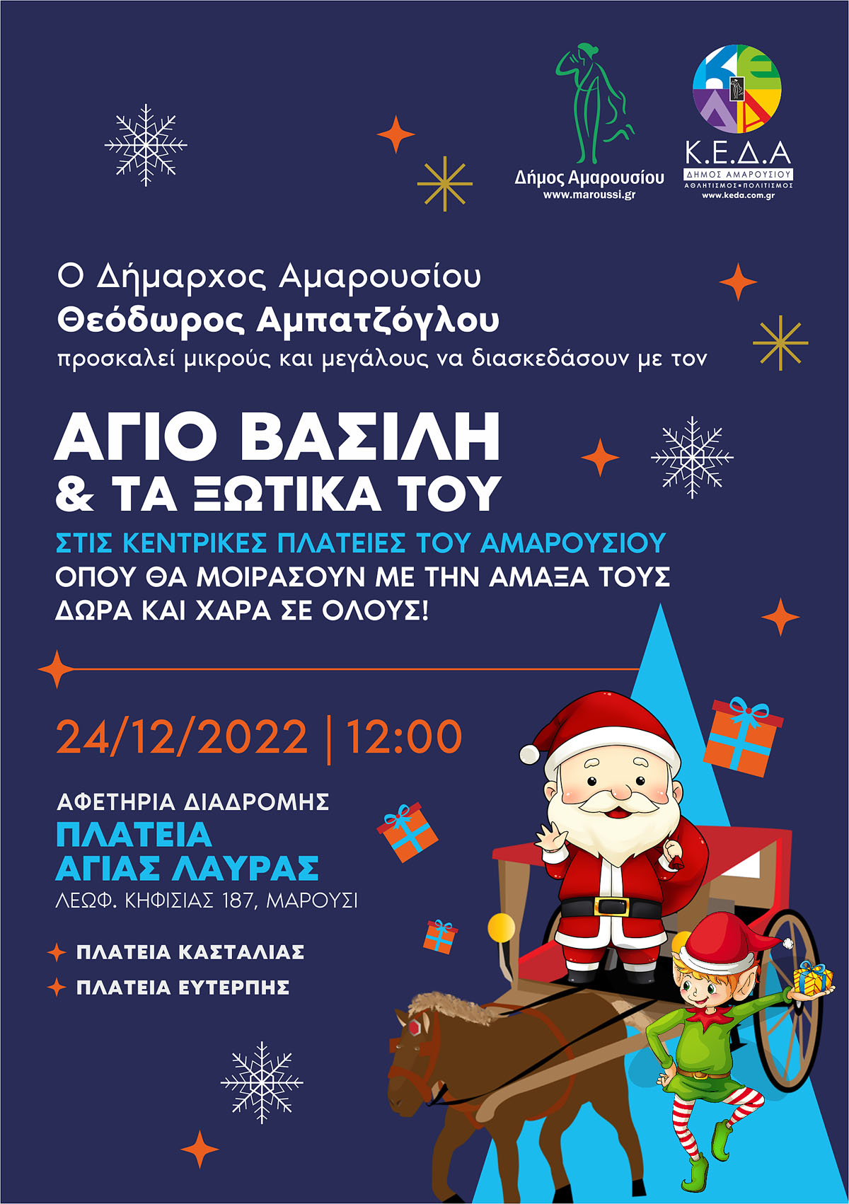 Ο Άγιος Βασίλης με τα ξωτικά του, το μεσημέρι της παραμονής Χριστουγέννων, Σάββατο, 24 Δεκεμβρίου 2022, θα πραγματοποιήσουν βόλτα με την άμαξά του στις κεντρικές πλατείες του Αμαρουσίου. Η διαδρομή θα ξεκινήσει στις 12:00 από την πλατεία Αγίας Λαύρας, στο Χριστουγεννιάτικο Χωριό, θα συνεχίσει στην πλατεία Κασταλίας με τελικό προορισμό την πλατεία Ευτέρπης (Σταθμό ΗΣΑΠ). Σε όλες τις πλατείες ο Άγιος Βασίλης με την άμαξα του θα κάνει στάση και θα μοιράσει στα Μαρουσιωτάκια δωράκια, μπαλόνια και ευχές για Καλές Γιορτές.