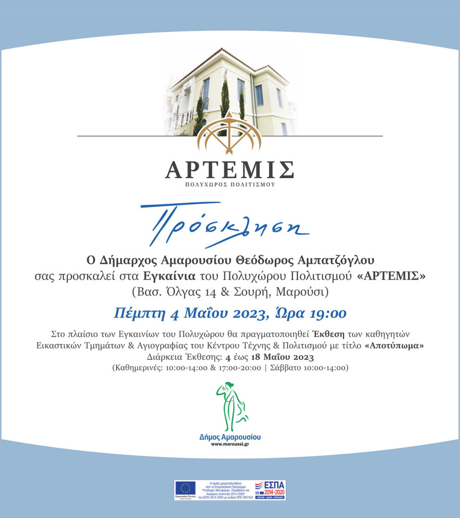 Εγκαίνια του Πολυχώρου Πολιτισμού «Άρτεμις» (Βασ. Όλγας 14 & Σουρή, Μαρούσι), Πέμπτη, 4 Μαΐου, ώρα 19:00