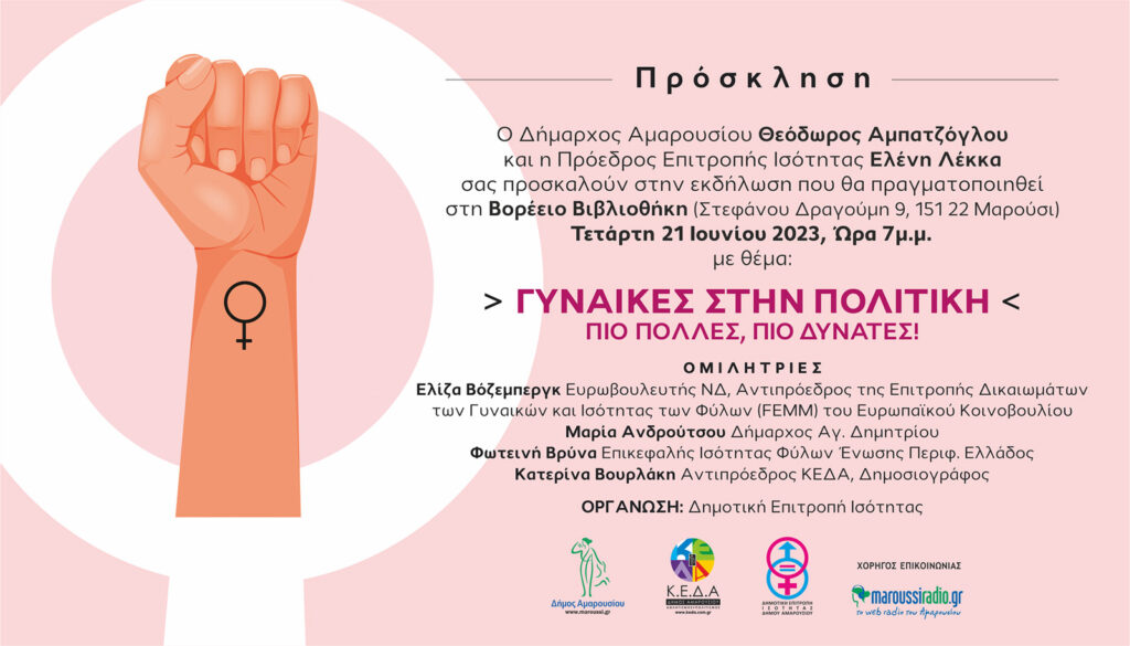 «Γυναίκες στην πολιτική-Πιο Πολλές, Πιο Δυνατές»: Εκδήλωση του Δήμου Αμαρουσίου, 21η Ιουνίου 2023, ώρα 7μ.μ. Βορέειος Βιβλιοθήκη