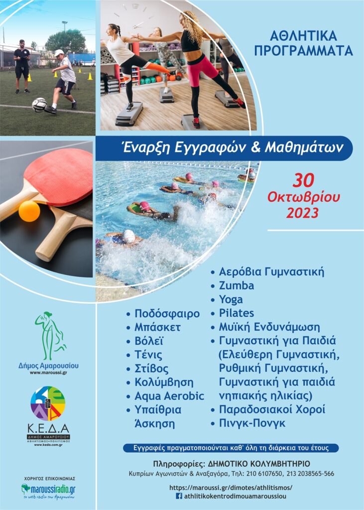 Ξεκινούν οι εγγραφές και τα μαθήματα στα Αθλητικά Προγράμματα του Δήμου Αμαρουσίου τη Δευτέρα, 30 Οκτωβρίου 2023