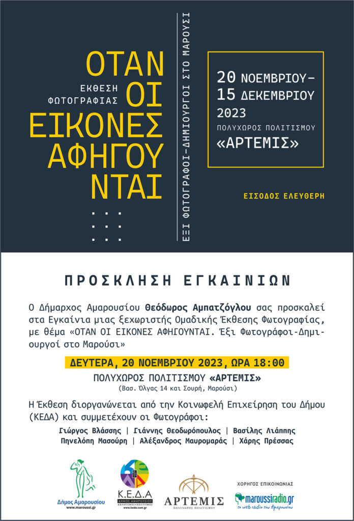 Εγκαίνια Έκθεσης Φωτογραφίας με τίτλο:«OTAN ΟΙ ΕΙΚΟΝΕΣ ΑΦΗΓΟΥΝΤΑΙ Έξι, Φωτογράφοι-Δημιουργοί στο Μαρούσι» – 20 Νοεμβρίου 2023, ώρα:18:00, Πολυχώρος Πολιτισμού «Άρτεμις»
