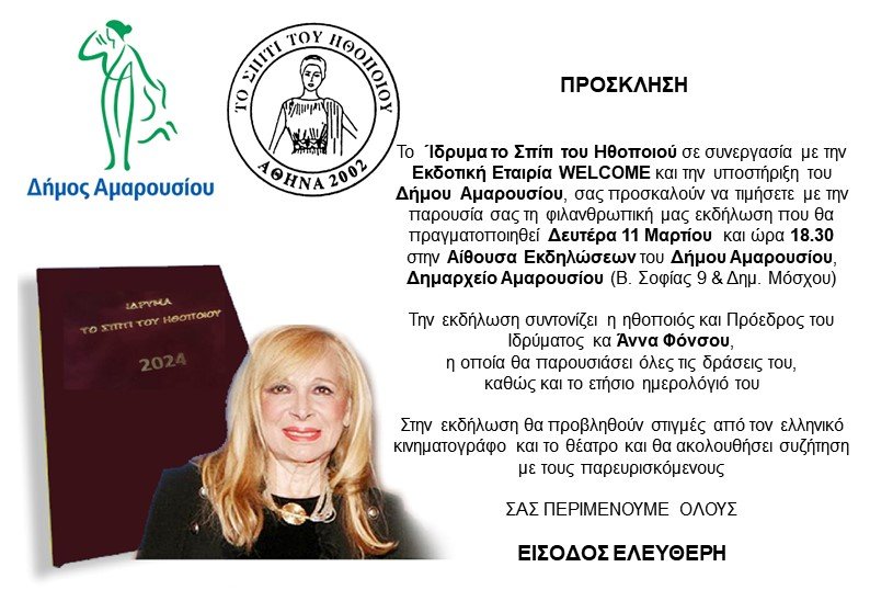 Το Ίδρυμα το Σπίτι του Ηθοποιού σε συνεργασία με την εκδοτική εταιρία WELCOME και την υποστήριξη του Δήμου Αμαρουσίου, διοργανώνει φιλανθρωπική εκδήλωση για τον Πολιτισμό, τη Δευτέρα 11 Μαρτίου 2024, και ώρα:18:30, στο Δημαρχείο Αμαρουσίου (Βασ. Σοφίας 9 & Δ. Μόσχα).