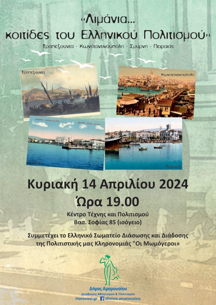 «Λιμάνια… κοιτίδες του Ελληνικού Πολιτισμού» Μουσικοχορευτική εκδήλωση για τα ιστορικά λιμάνια Τραπεζούντα-Κωνσταντινούπολη-Σμύρνη-Πειραιάς από το Δήμο Αμαρουσίου, Κυριακή 14 Απριλίου 2024, ώρα:19:00, Κέντρο Τέχνης & Πολιτισμού