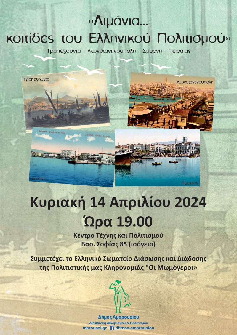 Με αφορμή τη συμπλήρωση 100 χρόνων από τη Συνθήκη της Λωζάννης, ο Δήμος Αμαρουσίου διοργανώνει μουσικοχορευτική εκδήλωση με τίτλο: «Λιμάνια… κοιτίδες του Ελληνικού Πολιτισμού» Τραπεζούντα-Κωνσταντινούπολη-Σμύρνη-Πειραιάς, την Κυριακή 14 Απριλίου 2024, ώρα:19:00, στο Κέντρο Τέχνης & Πολιτισμού (Βασ. Σοφίας 85, Μαρούσι).