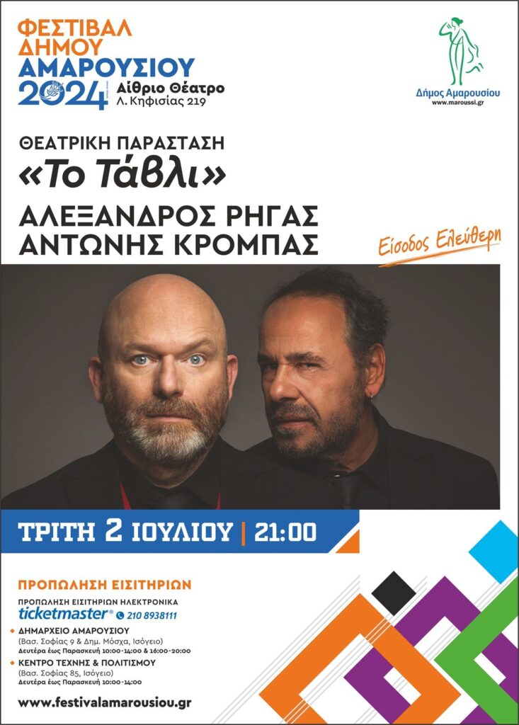 Φεστιβάλ Δήμου Αμαρουσίου 2024, ΘΕΑΤΡΙΚΗ ΠΑΡΑΣΤΑΣΗ «Το Τάβλι» – Τρίτη 2 ΙΟΥΛΙΟΥ | 21:00